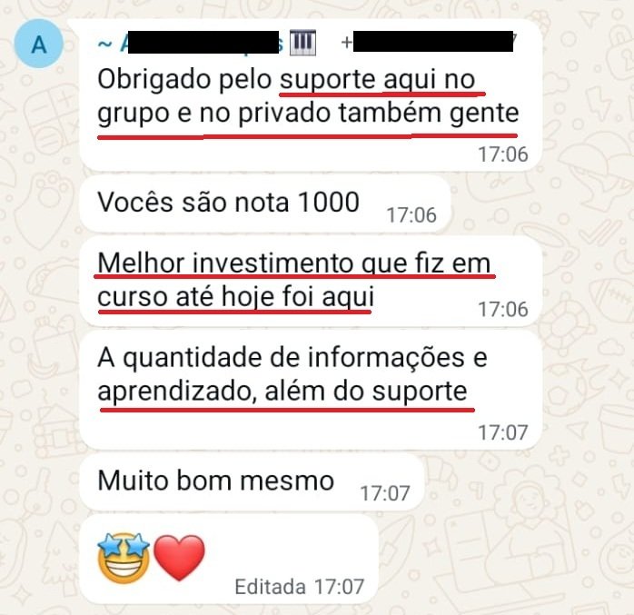 Sim, você terá acesso ao nosso Grupo VIP de suporte no WhatsApp durante um ano, para poder tirar todas as suas dúvidas referentes ao conteúdo.
